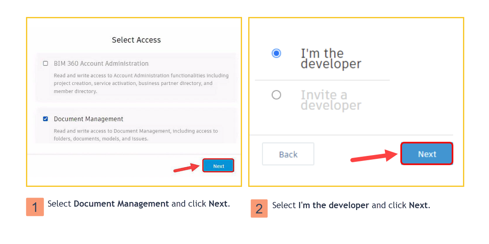 Depending on the product, you may be directed to the page shown in the image below. Select Document Management and then click Next. Then, select I’m the developer and click Next.